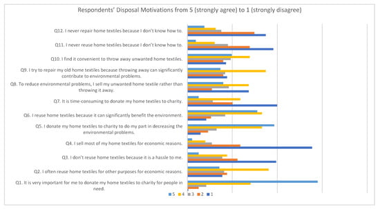 The survey aimed to understand customers’ decision-making processes relating to underlying behavioural motivations. The survey asked respondents to specify how they had disposed of textiles in the past twelve months. Responses were given on a 5-point Likert scale (1—strongly disagree; 2—disagree; 3—neutral; 4—agree; and 5—strongly agree). A Likert scale is suitable for this research, as it permits collection and classification of large quantitative data on a scale. The approach is considered reliable, depending on the reported (significant) coefficients, by Shaw and Wright [55] and Robinson and Shaver [56], and is often used as a suitable tool for measuring attitude and intention [57,58,59].