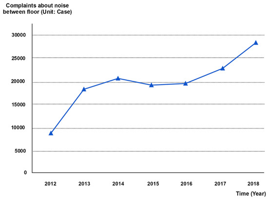 In particular, the wall column structure apartments built before 2005 in Korea generally used a concrete slab thickness ranging from 135 mm to 150 mm, but in recent years, with the emergence of frequent inter-floor noise problems, a new regulation was established to standardize the slab thickness to be at least 210 mm [3]. Despite the legal regulations on the slab thickness, the number of complaints related to inter-floor noise has increased from 8795 in 2012 to 28,231 in 2018 (Figure 1).