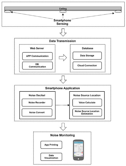 Figure 2 shows the configuration of the proposed monitoring system for the measurement of inter-floor noise levels and the estimation of noise source locations. In general, the system contains four steps. In the first step (the inter-floor noise sensing step), noise and vibration data are obtained from the place where data acquisition is required. Data is collected using the microphone, gyroscope, and accelerometer embedded in a smartphone. The decibel value and vibration velocity (i.e., noise data) are acquired every second, and the surrounding noise is recorded every minute. The acquired noise and vibration data are then transferred to a web server through Wi-Fi wireless communication in the second step (the inter-floor noise data transfer step). In this case, the transferred data consist of the ID and location of the measuring device, noise acquisition time, decibel level (dB) values, and vibration velocity (m/s2). The web server stores the transferred data in a database in real time.