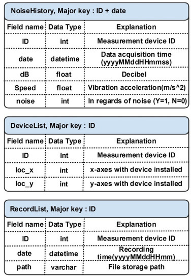 Figure 3 shows a schema of tables that are stored in a database. The database consists of a number of tables, such as the NoiseHistory, DeviceList, and RecordList. Each table contains noise data, information on noise measuring devices, and recorded files. In the NoiseHistory table, the ID of the device that transferred the data, acquisition time, decibel values, and vibration velocity are stored. When the decibel value is higher than the threshold, “1” is recorded in the noise field. In this instance, noise is determined using the criteria displayed in Table 1. Information on the ID and location of each device is stored in the DeviceList table. Information on the files recorded by each device is stored in the RecordList table. In the third step, the developed application estimates the location of the noise source, based on the records stored in the database. The application stores the noise data values in real time, converts them into decibel values, and determines the noise location using the estimation algorithm. In the final step, the acquired inter-floor noise information is visualized on the user’s smartphone screen.