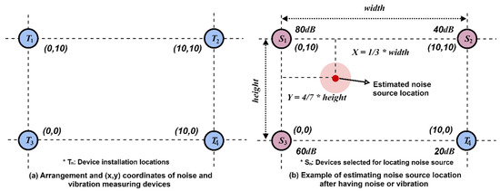 For example, when a noise or vibration takes place, assuming that the highest decibel value was observed in among the devices (), the device is set as . Subsequently, as shown by Equation (2), the device () located on the horizontal line of is selected as .