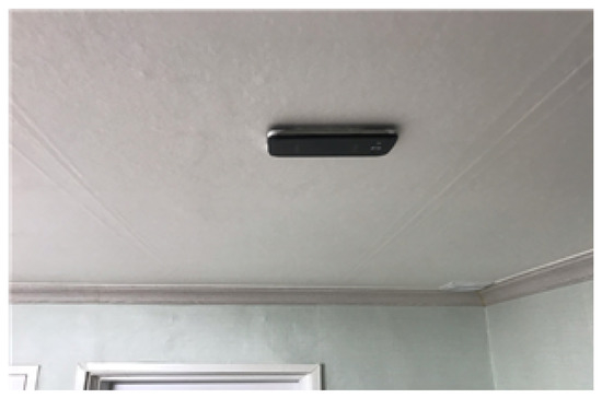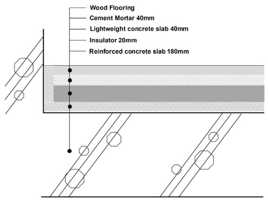 The floor of the experiment site consisted of a reinforced concrete slab (180 mm), insulating materials (20 mm), lightweight concrete (40 mm), cement mortar (40 mm), and floor finishing materials (Figure 6). To collect noise and vibration data, smartphones were installed on the ceiling of each room (Figure 7). The exact installation locations can be found on the floor plan (Figure 4). The smartphone located at the bottom left corner was then designated as the origin, and the scales were marked at 24.2 cm intervals in the horizontal direction and at 23 cm intervals in the vertical direction.