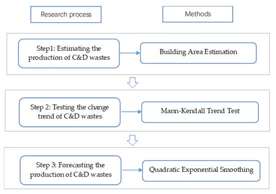 Quantitative waste prediction is crucial for waste management. Apart from estimation and prediction techniques, no method can be used to accurately and easily estimate the amount of waste produced by C&D projects. Estimation involves calculating the historical quantity of building waste and prediction determines the future production of construction waste on the basis of historical data. Three main methods can be used to estimate the output of C&D waste, namely, building area estimation method, material flow analysis (MFA) approach, and geographic information system (GIS) method [7,8,9].