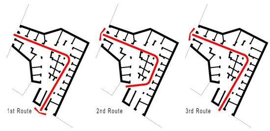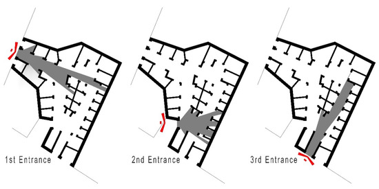 To reach the research goal and studying the between spatio-visual properties in general, and visibility in particular, and user perception, as the first stage architectural drawings are made. Drawings are imported into UCL Depth Map [59] and Isovist app to analyze the isovist field for major paths (see Figure 5). That has been derived from field observations. Although the form of the second and the third route is the same the direction is quite different, and this similarity helps the research to go one step deeper.