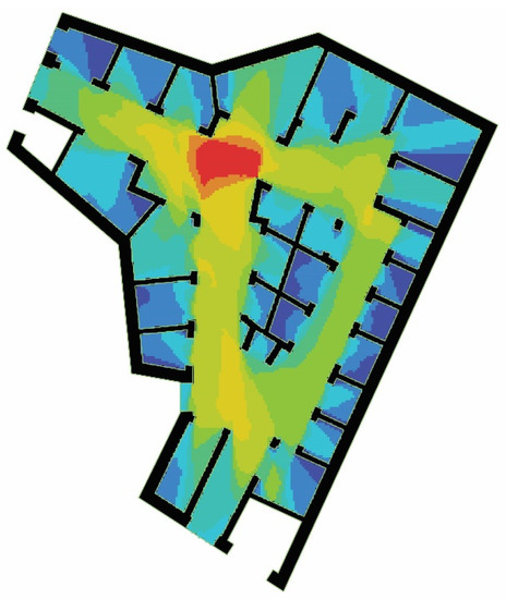 We used UCL Depthmap and Isovist app [59] to perform isovist analysis. This software provides three types of visibility analysis, specifically isovist analysis, isovist field analysis, and VGA. The isovist analysis is appropriate for predefining observation points, while the isovist field provides the visibility polygon for the whole path. On the other hand, VGA is suitable for providing an encompassing overview of the visibility distribution of the complex. Indeed, the selected variables show the potential of a specific point, path, and the entire complex respectively in terms of visibility. By reviewing the result of these experiment some facts should be pointed out. Firstly, it is clear that the more a path crosses points with high visibility the higher average visibility it has which seems an obvious conclusion (see Figure 7).