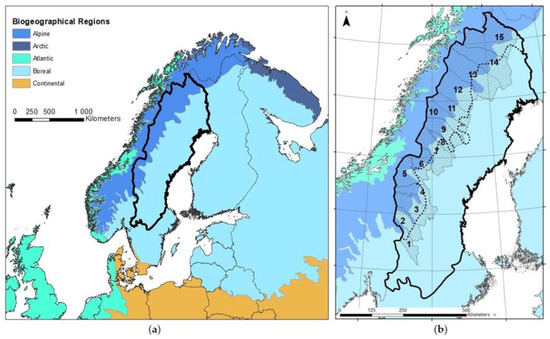 The study area covers: (a) North Sweden, including the entire alpine biome and a very large share of the boreal biome; (b): The mountain region with the 15 municipalities (thin black line and shaded surface) in the Swedish territory of the Scandinavian mountain range and north Sweden, divided into the alpine (dark blue) and boreal (light blue) biomes. Mountain municipalities: Malung (1); Älvdalen (2); Härjedalen (3); Berg (4); Åre (5); Krokom (6), Strömsund (7); Dorotea (8); Vilhelmina (9); Storuman (10); Sorsele (11); Arjeplog (12); Jokkmokk (13); Gällivare (14); Kiruna (15).