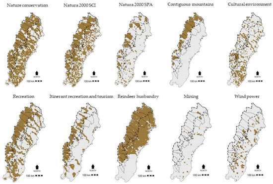 In this study, we have taken an explorative approach to broad geographic and multiple-scale sustainable landscape planning, departing from the economic, ecological, and sociocultural sustainability dimensions in general and from specific land-use interest and landscape values. In Sweden, national interests (Swedish: “Riksintressen”) are legally recognized and defined in the Swedish Environmental Code [49]. These chapters are included in a segment of the Code where possibilities for multiple land-use opportunities are acknowledged and promoted if in accordance with sustainable development of the recognized values. Hence, we explore and move forward sustainable landscape planning based on an already existing legal foundation that currently is in use in comprehensive planning, and that is also associated with a municipal mandate to exercise practical landscape and land-use priority decision-making [3,50]. Since forestry is a dominant form of land use in Sweden in general, and in northern Sweden in particular [26], land where forestry is or can be performed is included as a baseline land use.