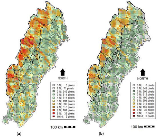 Our results clearly show that the overlap of NIs and “Forestry land” is extensive across the whole study region, but particularly in the mountain region and in the alpine biome (Figure 3a). A very small fraction of the study region (0.07%, Sorsele municipality) has an overlap of 10 out of the 11 different categories, 31% has an overlap of six or more categories, and 85% an overlap between three and eight categories. Only 2% of the study region has one single category occurring, with these fragments largely confined to the boreal biome and the easternmost parts of the mountain region, and are understood as covered by “Forestry land”. In addition, without “Forestry land”, the main overlap patterns and hotspots with high overlap frequency remain (Figure 3b).