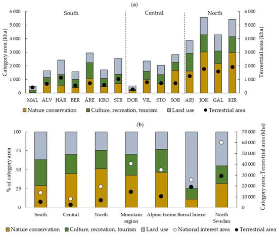 (a) National interest and forestry land area (left axis bars) and total terrestrial area (right axis points) in 1000 ha for the Nature Conservation, the Cultural, Recreation, and Tourism, and the Land Use classes for the mountain municipalities with division into southern, central and northern mountain sub-regions. (b) Percent class area of national interest area (left axis bars) and total national interest and terrestrial area (right axis points) for the mountain sub-regions, the mountain region, the alpine and boreal biomes, and the entire study region of northern Sweden.