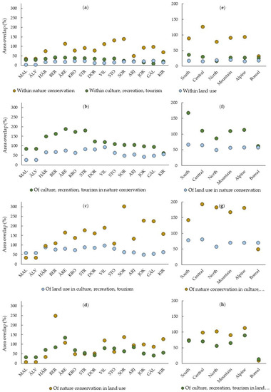 (a–d) Percent cumulative area overlap of national interests and forestry land for the mountain municipalities; (e–h) for the southern, central, and northern mountain sub-regions, the mountain region, and the alpine and boreal biomes. (a) and (e): Overlap within the Nature Conservation, the Cultural, Recreation, and Tourism, and the Land Use classes. (b) and (f): Overlap of the Cultural, Recreation, and Tourism and Land Use classes in the Nature Conservation class. (c) and (g): Overlap of the Land Use and the Nature Conservation classes in the Cultural, Recreation, and Tourism class. (d) and (h): Overlap of the Nature Conservation and the Cultural, Recreation, and Tourism classes in the Land Use class. See Table 2 for municipality abbreviations.