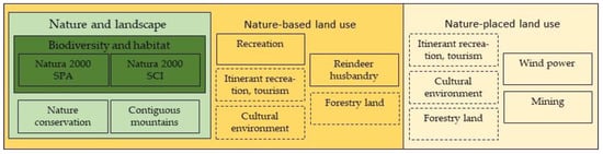 We clustered the NIs and “Forestry land” into three main classes that basically reflected ecological, socio-cultural, and economic sustainability dimensions. Our classification did not strictly define each type of NI as in one specific class. “Reindeer husbandry”, for example, is a land use based on economic incentives, but also represents high social and cultural values as it is an indigenous cultural expression with a very long history. In addition, reindeer grazing maintains the openness of the alpine environment, which is of fundamental value for recreation and tourism activities [59]. We found, however, that the classification assisted the analyses and our interpretations well. We found extensive overlap within each class, particularly within the Nature Conservation class and the Cultural, Recreation, and Tourism class. We also found clear south-to-north trends in increasing abundance of the Nature Conservation class and decreasing abundance of the Land Use class, except for “Reindeer husbandry”.
