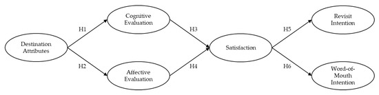 Customer loyalty is especially important to businesses due to it being a strong determinant of customer retention and eventual profitability [68,69]. Satisfaction alone does not necessarily lead to customer retention because of interferences such as switching intention and alternative attractiveness [70,71,72]. Therefore, many researchers always measure the level of loyalty in addition to satisfaction. Research on customer loyalty found that different behaviors indicate loyalty; most notable are repurchase/revisit, positive word-of-mouth/recommendation, willingness to pay a premium, and brand advocacy [53,68,70,71,73,74]. However, not all behaviors are applicable to loyalty to a tourism destination context [25,64]. Hence, this present study measures tourist loyalty using two constructs: revisit intention and word-of-mouth intention. The relationships between cognitive-affective evaluation, satisfaction, and loyalty intentions are demonstrated in several previous studies [11,12,18]. In a rural tourism context, a study found significant relationships of tourists' perceived quality to satisfaction and loyalty behaviors [12]. In sum, this present study proposed a hierarchical flow from destination attributes to cognitive-affective evaluation, then to satisfaction, and eventually tourist loyalty. Hypotheses 3, 4, 5, and 6 were developed to reflect the proposed conceptual framework. Additionally, Figure 2 illustrates the study model.