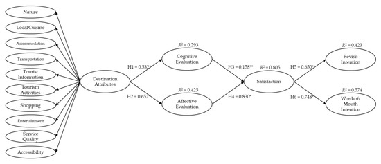 The path analysis follows the recommended two-step approach of structural equation modeling (SEM) technique by Anderson and Gerbing (1998) [78]. In the first step, a confirmatory factor analysis (CFA) is conducted to test the proposed study model’s goodness-of-fit statistics, validity, and reliability at the measurement model. The goodness-of-fit statistics have shown that at the measurement model, the data has a satisfactory fit to the proposed model (χ2 = 1338.811, df = 917, p < 0.001, χ2/df = 1.560, RMSEA = 0.46, CFI = 0.943, IFI = 0.944) when compared against the recommended thresholds [79,80]. Next, composite reliability was calculated for all latent variables, and the results (ranging from 0.821 to 0.912) were all higher than the recommended threshold of 0.7, providing evidence of reliability [79]. Convergence validity was assessed using the average variance extracted (AVE) scores, which should be higher than the recommended 0.5 [80]. During this process, six attribute dimensions were removed due to low loadings or failed to produce satisfactory AVE. They were climates, safety and security, heritage, perceived value, communication, and hospitality. The AVE values from all constructs ranged from 0.517 to 0.696. Hence, all exceeded the recommended threshold. Discriminant validity can be assessed by comparing the squared correlations against the AVE. The results showed that evidence of discriminant validity generally exists. However, the squared correlation of cognitive evaluation and affective evaluation, as well as affective evaluation and satisfaction were higher than the AVE [80]. Therefore, an additional step is required to further assess discriminant validity by combining items between both latent variables, then compare the chi-square against the base model. The test produced changes in chi-square difference of 39.397 and 69.627. The degree of freedom were both 5, and the p-values were less than 0.001. Hence, evidence of discriminant validity was established. A summary of the confirmatory factor analysis can be seen in Table 2.