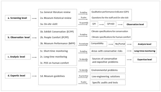 The “expertise level” is focused on solving specific environmental problems with low-energy and low-impact strategies, mainly related to maintenance, management and low-cost interventions for balancing heritage conservation and human comfort requirements [55]. The results obtained in the previous steps are synthetized in specific guidelines for museum staff and visitors. Besides, specific audits and tests to be planned are defined to quantify complex environmental risks.