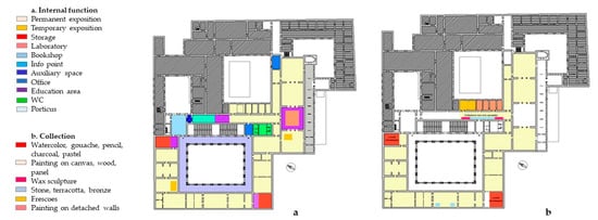 (a) internal building functions and (b) typology of objects of the Pinacoteca di Brera.