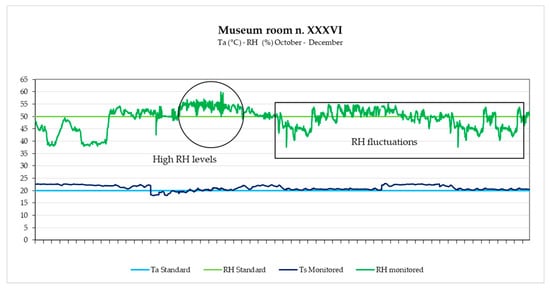 STM of environmental conditions shows several problems. The original project of Piero Castiglioni (1994) focused on the integration of natural and artificial light. It was devoted to enhancing the aesthetic and chromatic qualities of the exhibition, through the introduction of electronic regulators and metal halide vapor lamps. To improve the visibility of artworks, he employed higher light levels than the conservative standards [22,23,26,28], putting anti-UV and anti-IR filters on artefacts to guarantee their safeguard. The design project changed over the time, modifying the original criteria [71]. The STM conducted using the defined procedure (Section 4.3) confirmed the presence of E levels lightly greater than international standards [30,32]. The average value is 130 lux, lower than the standard requirements (150 lux), but several values are in the range 300–500 lux. Ta shows a stability in the range 20–22 °C, with an average value of 21 °C. This thermal condition causes risks only for the wax collection (Table 3). On the contrary, there are several RH fluctuations, but in the range of 40–55% over the years. The hygrothermal levels for a typical day are shown below (Figure 5).