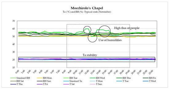 RH varies greatly while Ta is stable, as shown by long-term monitoring in a typical week (Mocchirolo’s Chapel, room n. Ia).