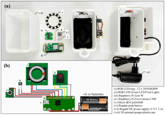 Figure 2 shows a prototype of the proposed urine tester. An outdated mobile phone or a recent smartphone can be used, but the tester was simply developed with several essential parts to demonstrate a low-cost and low-tech device. The cost breakdown of our urine tester is presented in Table S3 in the Supplementary Information. It comprises eight major components: (i) an RGB LED (light emitting diode) ring for uniform illumination (WS2812 NeoPixel Ring–12 × 5050 RGBW, NEX, Worldsemi, Guangdong, China); (ii) an RGB LED as a system status indicator (WS2818 9 mm LED Pixel Light, Worldsemi, Guangdong, China); (iii) a Raspberry Pi Zero W as a microprocessor (Raspberry Pi Zero W, Raspberry Pi Foundation, Cambridge, UK); (iv) a Raspberry Pi Zero 5 MP Camera for capturing images of urine test strips (Raspberry Pi Camera Module v1, Raspberry Pi Foundation, Cambridge, UK); (v) a 64 GB micro SD card for storing images and processing data (64 GB microSDXC, SanDisk, CA, US); (vi) a regular push switch for system operation and control; (vii) a regular DC power supply/adaptor (5 V, 1.5 A); and (viii) a 3D-printed opaque plastic box for minimizing light interference.
