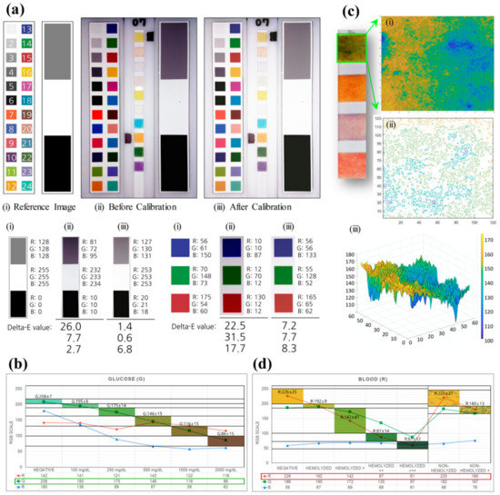 The urine tester operates automatically as soon as a urine test strip is placed in a dark room and the device is switched on. Subsequently, the camera module starts capturing images of the urine test strip, comprising ten different reagent pads that change color in response to the urine sample. The urine test strip is ready approximately 1 min after being dipped in the urine. As shown in Figure 3a, the white and color balances need to be well established to increase the accuracy of the urine test device. Firstly, for the white balance, we used a black-and-white paper strip as a reference (i) and then manipulated the lighting conditions when capturing images, resulting in a very low DE value (<6.9); here, DE2 = (R1 − R1)2 + (G1 − G1)2 + (B1 − B1)2 is widely used to compare two images with a single representative figure [60]. In general, DE approaches zero when two colors are identical and becomes increasingly large as two colors become increasingly different; see the images and DE values before (ii) and after calibration (iii) in Figure 3a. Secondly, we controlled the color balance in the same manner. The RGB values of the three images (i.e., the reference image (i), the image before calibration (ii), and the image after calibration (iii)) were compared using the DE equation, resulting in color images that could be well calibrated by matching the color balance between them; the DE values were less than 8.3 after calibration.