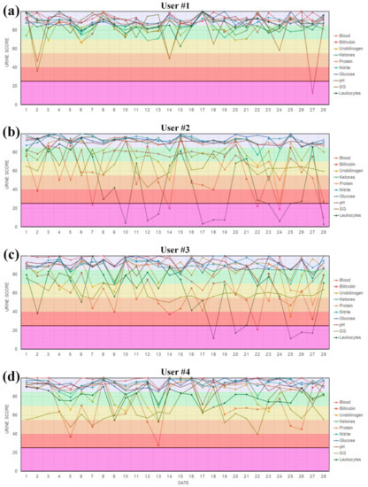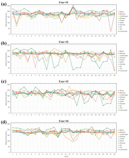Experimental results collected from four participants using the urine tester for four weeks. (a) “User #1”. (b) “User #2”. (c) “User #3”. (d) “User #4”. These are randomly named for convenience.
