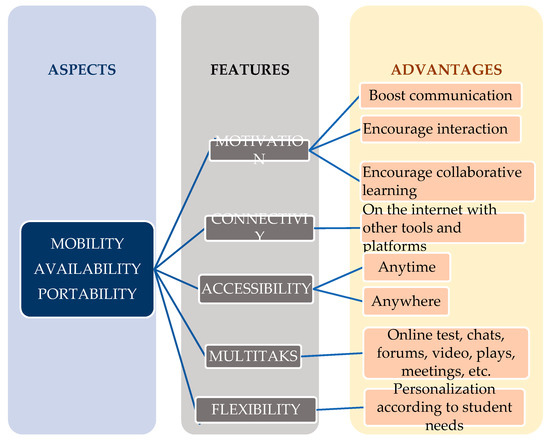 Mobile computing devices can provide educational opportunities [5,6], improving the learning process due to better interaction [7] and nowadays m-learning is practically identified with distance learning due to their mutual synergy [8]. When distance learning is carried out within an official university program, a distance teaching institution is guaranteeing the integration of online learning tools in a virtual learning environment (VLE). Usually, a VLE is specifically made for the teaching objectives, according to the university’s methodology. The VLE must consider the personal characteristics of students in the program, adapting the best possible combination of online learning tools in the present context of m-learning. The design of VLE for mature students must take student’s learning difficulties into account, such as lower technological aptitudes linked to older age students, family obligations, and less availability due to the fact that they are generally part-time students. Aspects, features, and advantages of m-learning (see Figure 1) support the utility of online tools for learning in the Era of Mobile.