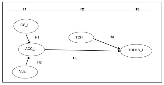Variables and hypotheses. Notes: The Hypotheses suppose that GS_I and VLE_I have relevant effects on ACC_I at time 1, ACC_I (measured at time 1) and TCH_I (measured at time 2) have relevant effects on TOOLS_I.