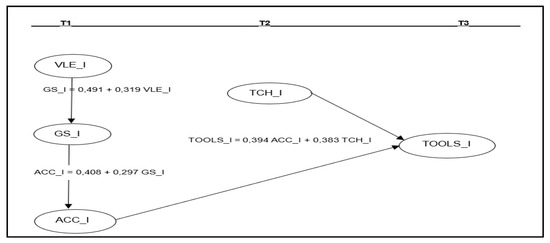 The results do not show correlation among TCH_I (T2) and the variables at Time 1. However, TCH_I (T2) correlates positively with TOOLS_I (T3), that is the final objective. Variables measured at T1 (GS_I, VLE_I, and ACC_I) correlate with TOOLS_I (T3). Consequently, several regressions were performed to test whether relationships among TOOLS_I and its correlated variables correspond to spurious or causal correlations.