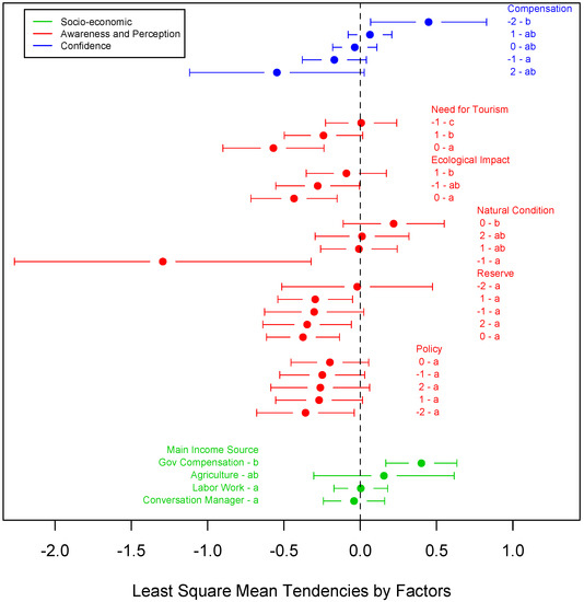 In this figure, post hoc multiple comparisons for ANOVA results with significant p-values are shown by factors. The least square mean residents’ tendencies to their optimized livelihood and conservation policy are displayed by significant ANOVA results in three groups, namely socio-economic, awareness and perception, and confidence in government groups. From bottom to top are the main income source (a socio-economic factor, in green color), awareness of conservation policy, awareness of natural reserve, score for natural condition, the perception of ecological impacts and the need for tourism development (five awareness and perception related factors, in red color), and the confidence of government compensation (a confidence in government factor, in blue color). The levels of each factor are specified in alignment with their 95% confidence intervals of the mean tendencies (as the x-axis) for each level of the explanatory variables. Significantly different levels within each factor are marked using the post hoc marking scheme (e.g., a, is significantly different from b, but not from ab).