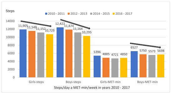 The purpose of this study was to identify secular trends in the achievement of PA guidelines by Czech adolescents. The most important finding is a continuous statistically significant decrease in the average number of steps/day in girls and boys over the eight-year period of pedometer PA monitoring until 2016–2017. The results are consistent with the previously observed decrease in the number of steps/day in adolescent boys but not girls in the Czech Republic in 1998–2000 and 2008–2010 [10]. A secular decrease in steps/day and, at the same time, MVPA from 2003/2004 to 2016/2017 was also reported by Sasayama et al. [51] in Japanese children. In Swedish adolescents, Raustorp et al. [52] observed a decrease in average steps/day between 2000 and 2017 by 24% in boys and 30% in girls. The fact that in girls a secular decrease in overall PA subjectively estimated by the IPAQ-LF questionnaire was not confirmed is probably related to the overall lower weekly PA in girls as opposed to boys, but this in principle does not challenge the conclusions on the overall decrease in PA over the eight-year period.