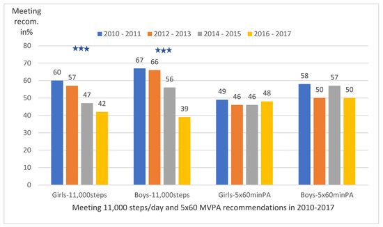 Meeting the recommendation of 11,000 steps/day and at least 5 × 60 min of MVPA in girls (n = 1129) and boys (n = 779) between 2010 and 2017. *** p < 0.001.