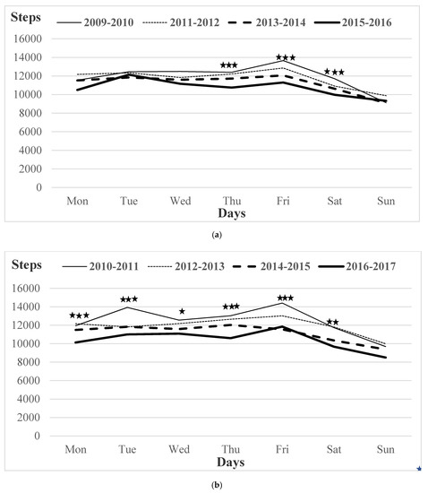 Steps/day during the week in girls (a) and boys (b) between 2010 and 2017. * p < 0.05, ** p < 0.01, *** p < 0.001.