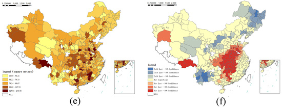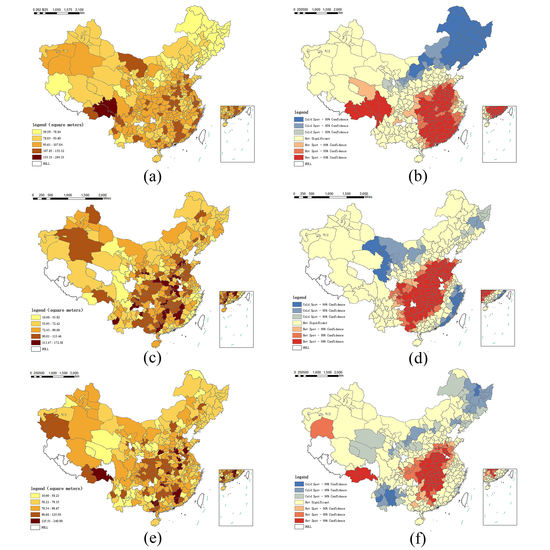 Spatiality of the household housing space consumption of locals, inter- and intra-provincial migrants in urban China: (a) local household housing space (m2); (b) hotspot analysis of local household housing space; (c) inter-provincial migrant household housing space (m2); (d) hotspot analysis of inter-provincial migrant household housing space; (e) intra-provincial migrant household housing space (m2); (f) hotspot analysis of intra-provincial migrant household housing space.