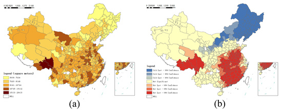 Spatiality of the household housing space consumption of locals in urban China: (a) local household housing space (m2); (b) hotspot analysis of local household housing space.