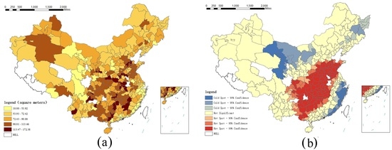 Spatiality of the household housing space consumption of inter-provincial migrants in urban China: (a) inter-provincial migrants’ household housing space (m2); (b) hotspot analysis of inter-provincial migrants’ household housing space.