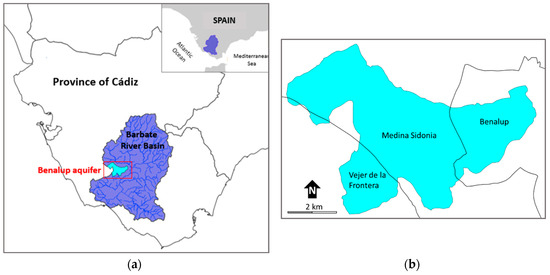(a) Location of the Barbate River Basin; (b) Detail of the Benalup aquifer and the municipalities that it encompasses.