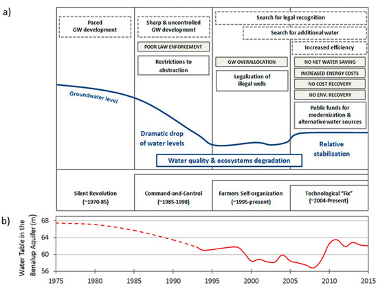 Finally, some authors (Stephano et al., 2015) [25] identify four general stages in the groundwater exploitation development in Spain, which are closely related to the national legal and economic scenario: (1) In the first stage (silent revolution), the number of wells increased in a paced manner, and the administrative efforts were focused on surface water. (2) The second stage coincided with the approval of the 1985 Water Act and the intensification of drilling activity. These circumstances, coupled with the severe drought of 1991-1995, the EU irrigation subsidies and the inability of water authorities to curb unauthorized groundwater extractions resulted in a dramatic drop in WT. At the same time, the consolidation and expansion of irrigation were strongly supported by the authorities responsible for land-use policies. (3) In the third stage, users began to associate to protect their activities from sanctions and well closure, to achieve their legal recognition as water users and to lobby for new water resources to complement the shrinking or increasingly expensive groundwater resources. (4) The fourth stage, termed “technological fix”, was marked by state-subsidized programmes for the modernization of irrigation systems and the search for additional water to complement groundwater resources and ensure the access to cheap, good-quality water. This situation in Spain has enabled the partial recovery of the water table in some aquifers. However, other factors, such as the occurrence of exceptionally rainy periods, that have favored the recharge of aquifers, or the fact that many farmers have hit the ceiling in their capacity to sell their products in a competitive way, choosing to consolidate their activity instead of increasing their pressure on the resource, must be considered.