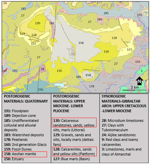 As Figure 2 shows, the aquifer is made up of Neogene and Quaternary detrital materials, from bottom to top: (i) cross-bedded Upper Miocene biocalcarenites with levels containing fossil fragments, (ii) yellowish-white calcareous sands of the Pliocene age and (iii) Quaternary aeolian sands of special interest regarding system recharge.
