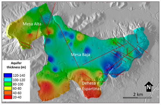 The Benalup aquifer constitutes a tabular relief that rises several tens of meters above the surrounding river network. Most of the formation is flanked by a perimetral scarp, and, according to physiographic criteria, it can be divided into three compartments, whose hydrogeological behavior is independent and will be discussed later: (i) Mesa Alta, located to the west (6 km2), (ii) Mesa Baja, that constitutes the major part of the aquifer (25 km2) and (iii) Dehesa de Espartinas, located in the southern area of the central sector (2 km2). The combined analysis of the DTM, the geological map of the area (Figure 3) and observations in situ allowed us to define the arrangement of the geological formations and revealed some significant tectonic accidents.
