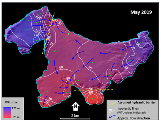 Piezometric map of the Benalup aquifer in May 2019, showing the water table (WT) level distribution. The blue arrows indicate the general flow direction in the porous media and the dotted yellow lines the assumed hydraulic barriers.
