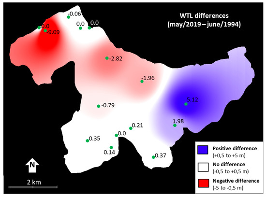 Differences in the water table level (WTL) recorded in May 2019 and June 1994 considering the coincident points of the monitoring network.