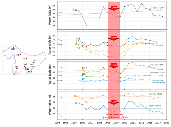 Evolution of the annual average WT level, obtained from monthly measurements at various points in the aquifer for the period 1993–2018 (25 years). The drought period 5/2005 to 11/2008 produced a general drawdown in the WT level of the aquifer.