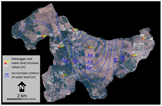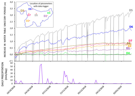 While in D4 the piezometric level rise in that period was practically nil, in D5 and D6 it was very sharp (3.22 and 1.94 m, respectively). The wells D2, D3 and D7 showed intermediate increases in their WT, around 0.8–0.9 m. Finally, D1 registered an intermediate piezometric evolution between the latter group and D4. Figure 9 shows the spatial distribution of the WT rises (attributable to the autumn rains of 2018) obtained from the interpolation of the values.