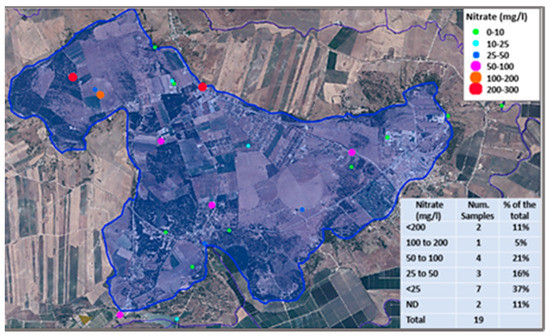 Nowadays, it is widely known that the agricultural activity represents the main source of nitrate inputs into the aquifers [33,34,35], an important problem that might lead to the declaration of these systems as being in poor condition. This is the case of the Benalup aquifer, declared in poor chemical condition for exceeding the permitted threshold values of this ion. For this reason, nitrate analyses were especially relevant in this study. Of the total of 35 samples collected during the two sampling campaigns, 17 (7 in December and 10 in May) exceeded the legal limit set at 50 mg/L, which represents about 50% of the samples. Figure 11 shows the spatial distribution of nitrate concentrations in the sampling campaign of December. The average NO3− concentration found was 44 mg/L, with values ranging between 0.8 and 250 mg/L. The latter value, which is extremely high, is attributed to point-source contamination from a poultry farm in Mesa Alta. Values of this magnitude were not detected during the second sampling campaign. In any case, during the second sampling (May), the nitrate average value was higher, 55.9 mg/L, with concentrations ranging from 0.6 mg/L (on a shallow borehole in a non-agricultural area) to 168.7 mg/L.