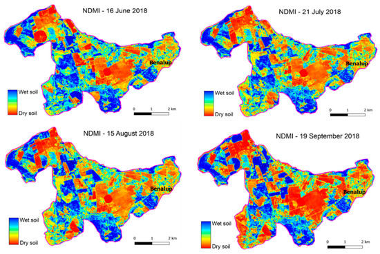 The Normalized Difference Moisture Index (NDMI) was used to spot the plots that were irrigated during dry periods. The NDMI was selected because it provides information about the level of water stress in crops [28]; in principle, high values of this index indicate soil moisture and, therefore, irrigation. The product that indicates the moisture level of crops was obtained from the combination of the NIR-Near InfraRed reflectance and the SWIR-Short Wavelength InfraRed reflectance: