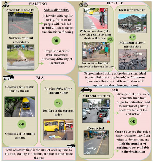 The respondent was presented with a chart explaining all the factors and their levels (Figure 2) to facilitate the understanding of questions. As an example, for the walking mode, the existence of accessible pavement was evaluated, being described as a good pavement that allows the locomotion of people with reduced mobility.