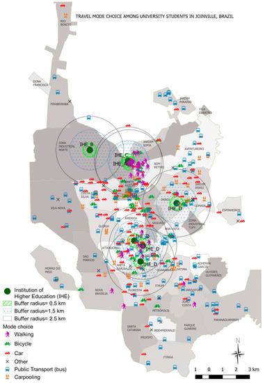 The 0.5 and 1.5 km buffers covered most non-motorized displacements, as stated by [11]. The region with the highest incidence of this occurrence was around universities A and C. This is a fact justified by the presence of two very close universities. Another reason is the existence of much student housing in that region, considering that many respondents come from other cities to live in Joinville to study. The central region also favors walking as a form of commute. However, in the southern region some students choose to walk even if the distance is more than 2.5 km.