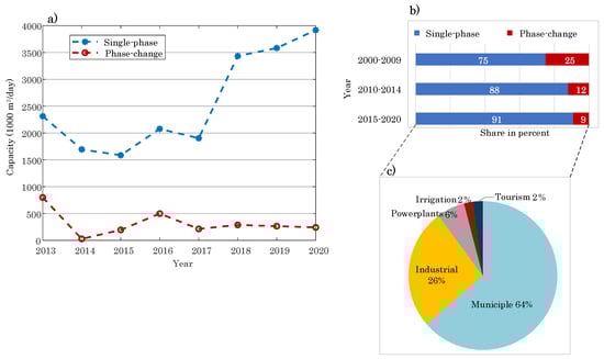 Figure 1. Total worldwide installed desalination: (a) capacity by technology; (b) technology share; and (c) share of each user for worldwide desalinated water [7].