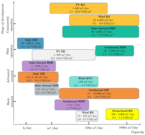 Figure 3. The status of the renewable energy operated desalination technologies (adapted from [5]).