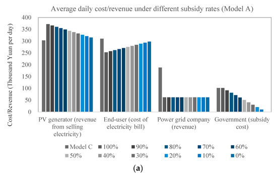 The results with different “end-user regulated prices” are shown in Figure 10. The “end-user regulated prices” are the terminal selling prices to the end-users. The results in Figure 10a show that the cost for end-users decreases as the “end-user regulated prices” decrease. The results in Figure 10b show that the decrease in cost for the end-users will lead to a decrease in the PV generators’ revenues through a bilateral negotiation mechanism. Figure 10c shows that as “end-user regulated prices” decrease, the revenues of the power grid company decrease in Model C, and stay the same in Model A and Model B. The reason is that in the non-marketization mechanisms (Model C), the power grid company buys and sells electricity at the government-guided prices. Unless the buying price decreases at the same time, the decreases in selling price are undertaken only by the power grid company. For the government, the subsidy cost is not impacted by the changes of the “end-user regulated prices”, as shown by Figure 10d.