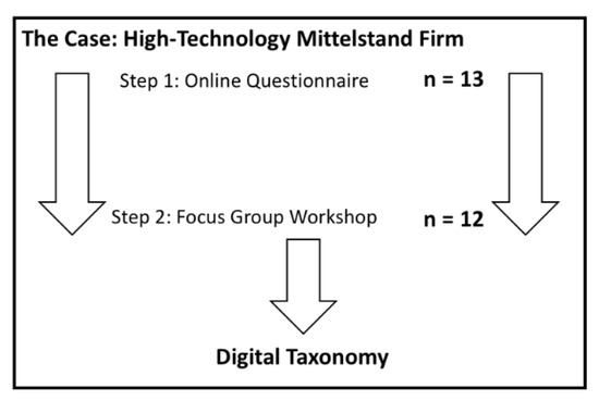 We conducted a twofold analysis (see with Figure 2): First, before the focus group, we conducted a pre-assessment of digital taxonomies through an online questionnaire. We then presented and discussed the results from the preliminary online questionnaire and the interrelated digital literature derivation in a focus group workshop onsite. Focus group workshops are appropriate to further reflect on and challenge the findings from literature and the questionnaire-based pre-assessment of digital taxonomies, as opportunities for different views of participants and clarification of responses emerge, which enables one to evaluate and value opinions and positions [54,55,56]. Thereby, the literature-based findings on “digital” were presented as a starting point. Based on that, a moderated discussion took place about if and how the suggested relationships are perceived in the individual firm branch setup.